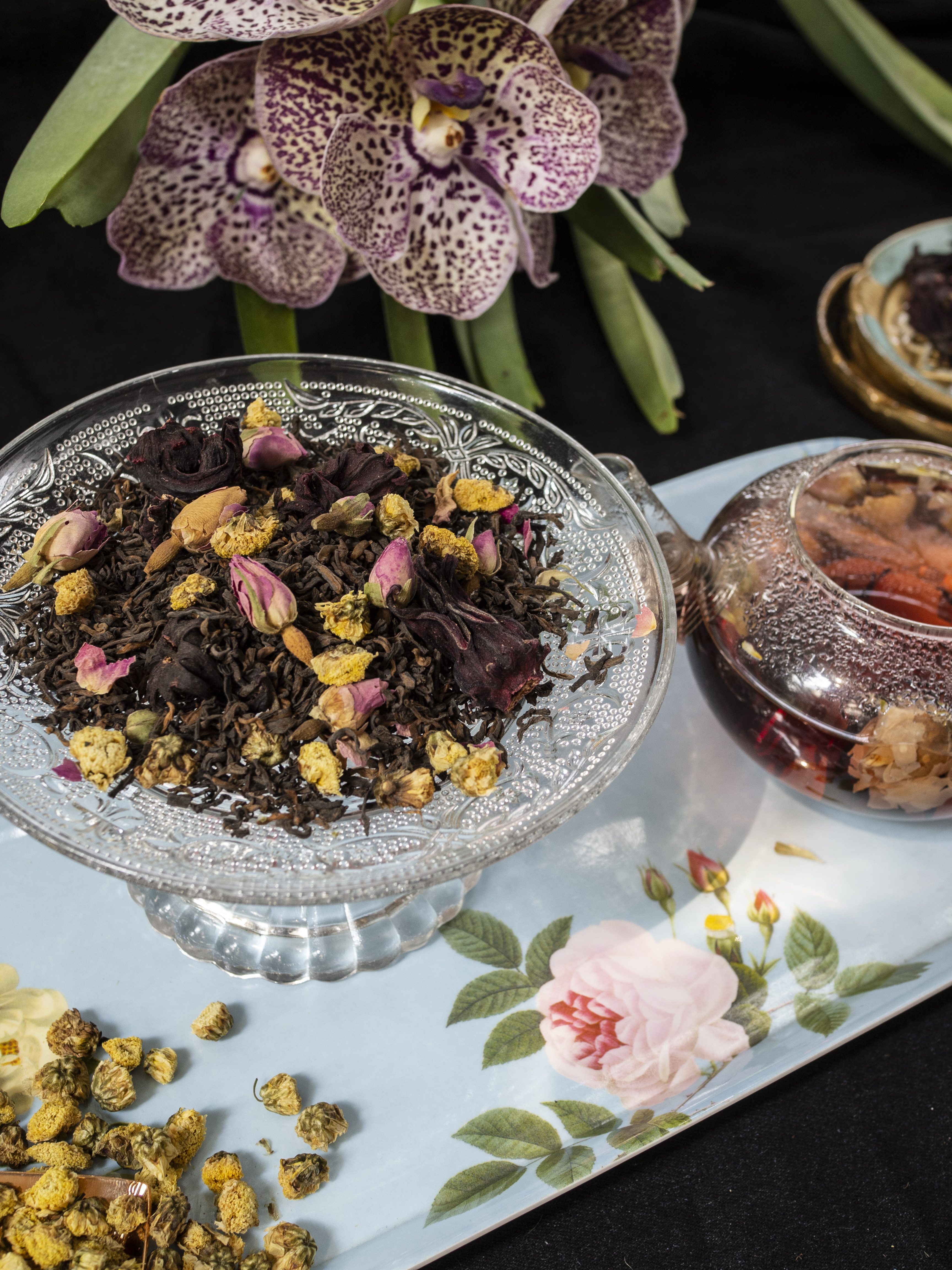 Initially, we thought black tea, but after more consideration, we realized pu-erh was the better choice. It’s the kind of tea that provides the perfect foundation for our two stars to shine with their own aromas and flavors, while pu-erh quietly supports from backstage.
